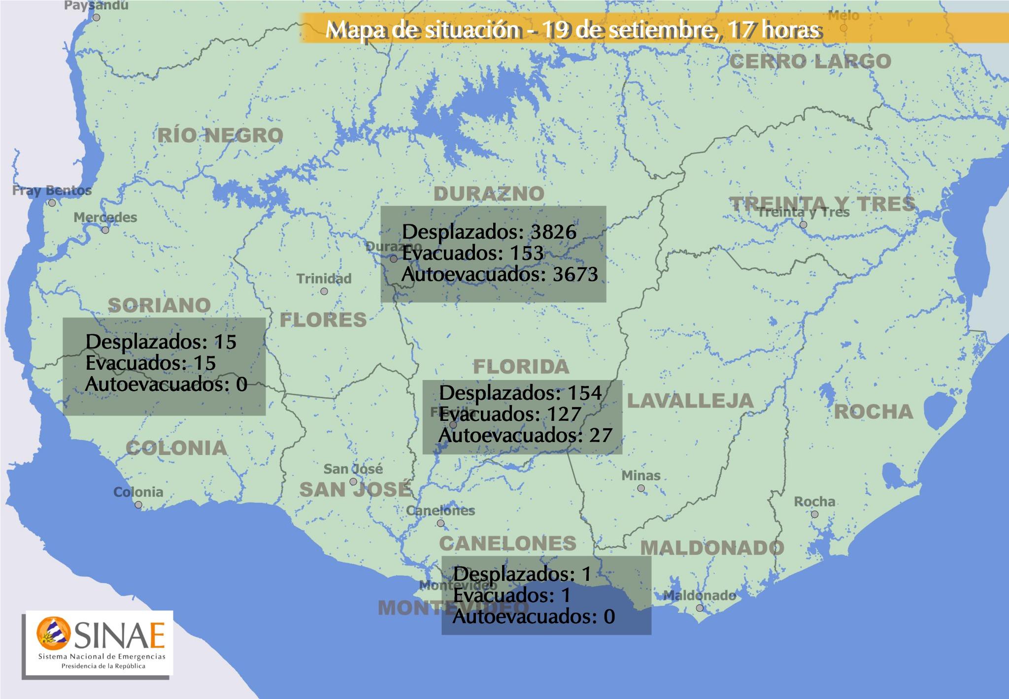 En todo el país hay seis departamentos afectados por las inundaciones: Canelones, Durazno, Florida, Soriano, San José y Treinta y Tres. El número total de personas evacuadas, es decir, personas que salieron de sus hogares y que están en albergues del CECOED respectivo recibiendo una atención integral, disminuyó a 296. El número estimado de personas autoevacuadas es 3700. El número total de personas desplazadas por las inundaciones es de 3996. Cabe aclarar que este aumento del número de personas autoevacuadas, no implica necesariamente que más familias hayan tenido que abandonar sus viviendas, sino que se debe a que personas que ya estaban alojadas en casa de familiares o en