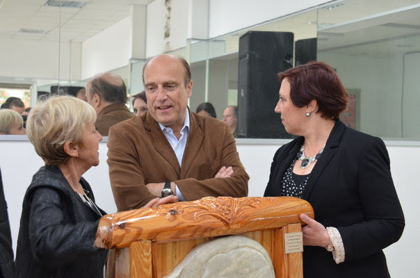 Los integrantes del Taller Sala 12, junto a la responsable de esta iniciativa, Selva Tabeira, entregaron a modo de reconocimiento, un sillón de pinotea, con la figura del rostro de Espert tallada en mármol.